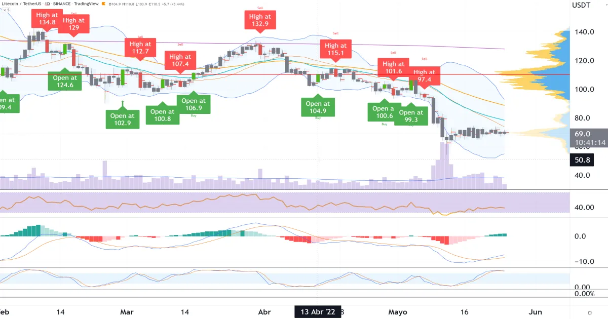 莱特币成本预测:5 月 24 日 50 天 SMA 高于 14 天 SMA。绘制的水平线使交易者能够意识到 50 美元的支撑程度是偶尔从区间点发生的激进下行力量的关键基线。市场正在适应翻拍